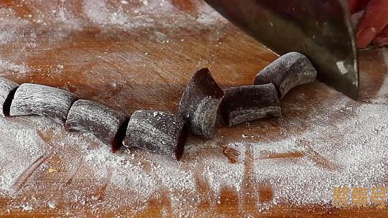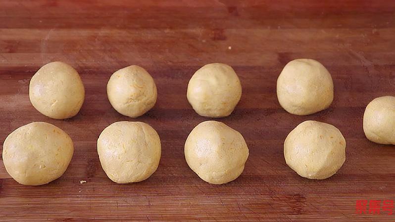 6、咱们的小圆球做好了之后,下面来包一下豆沙馅,把咱们准备好的豆沙馅挤到面板上,因为豆沙馅也是比较黏的,所以需要在面板上提前撒上一点干面粉,然后咱们用双手把豆沙馅给它揉搓成一个细一点的长条,然后再切成大小均匀的小段,最后揉成小圆球。
