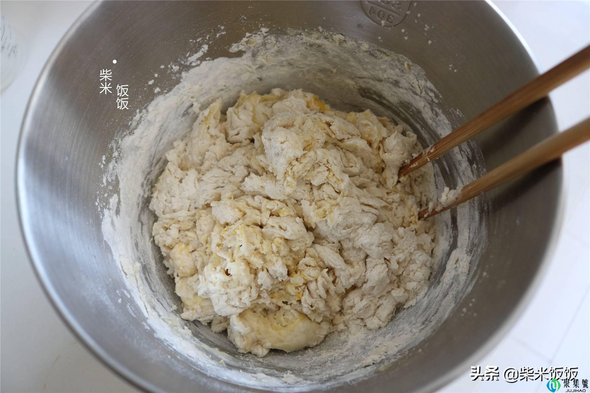 1,把除黄油以外的所有食材全部放入搅拌桶中,用筷子将水和食材混合,方便揉面。