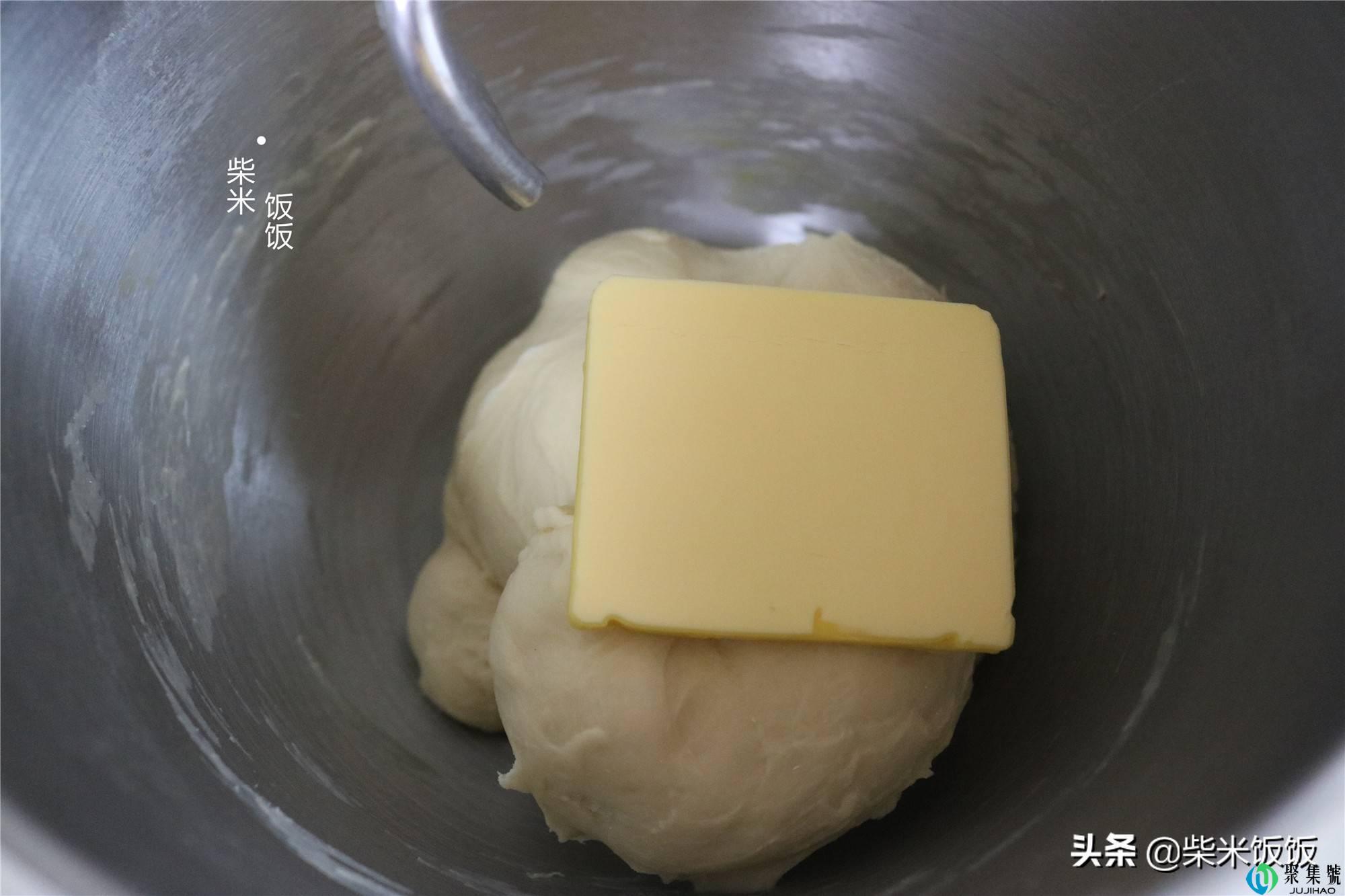 2,将面团揉10分钟左右,加入软化的黄油,继续中高速揉面10分钟左右。