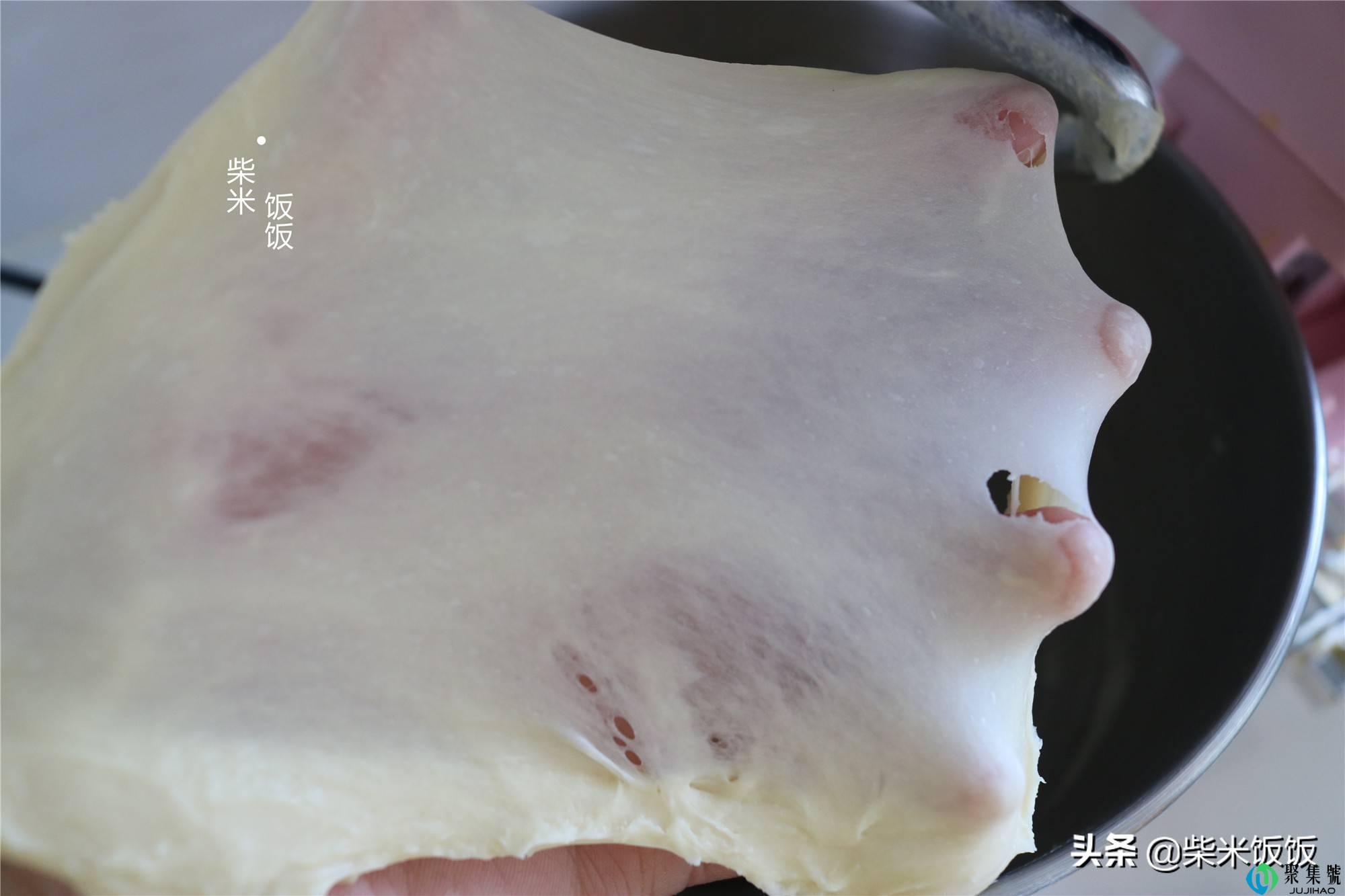 3,接下来隔两分钟就要停下来,剪一块面团检测一下,能拉出薄薄的手套膜,破洞的边缘没有锯齿,这样面团就揉好了。