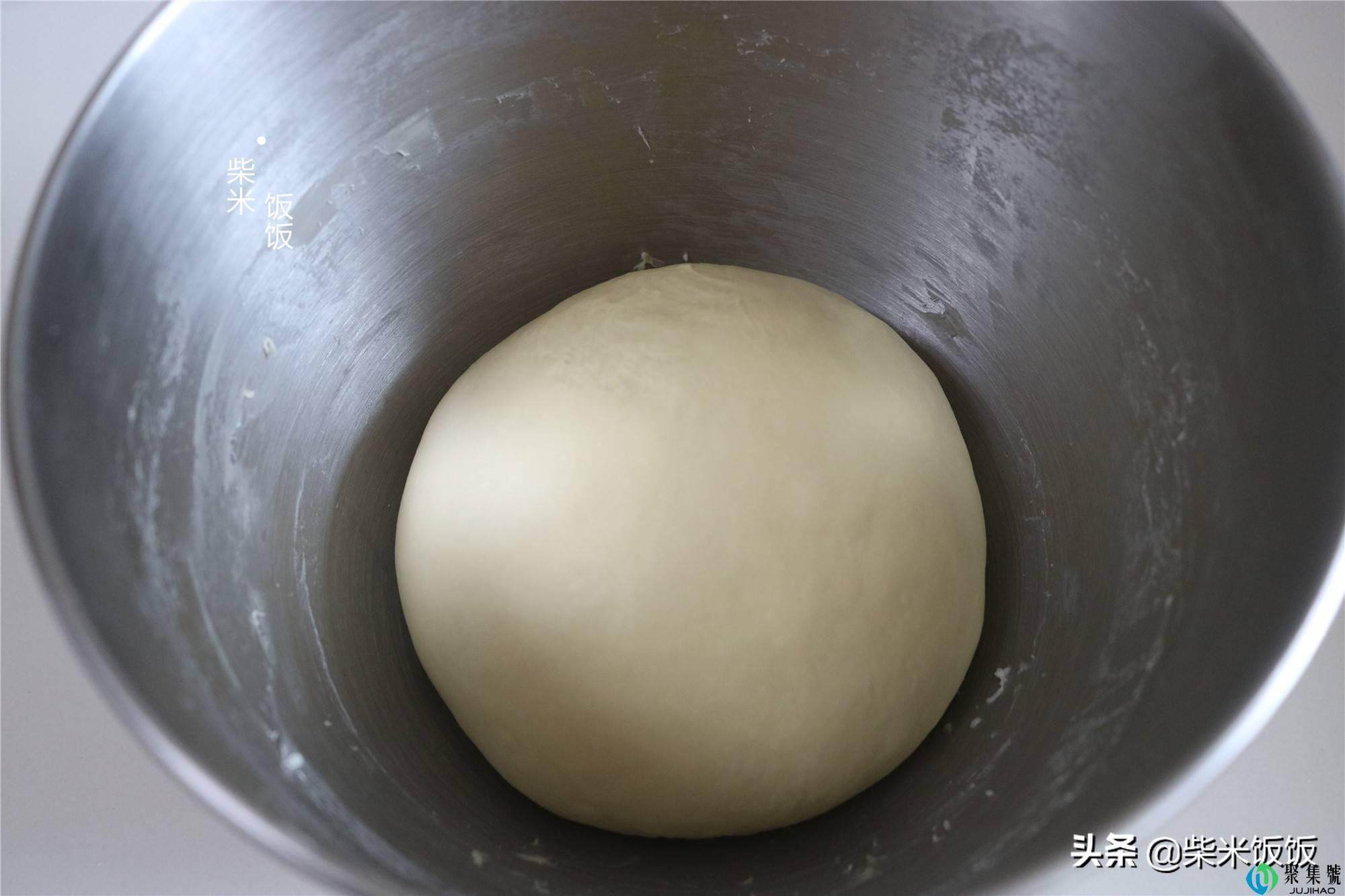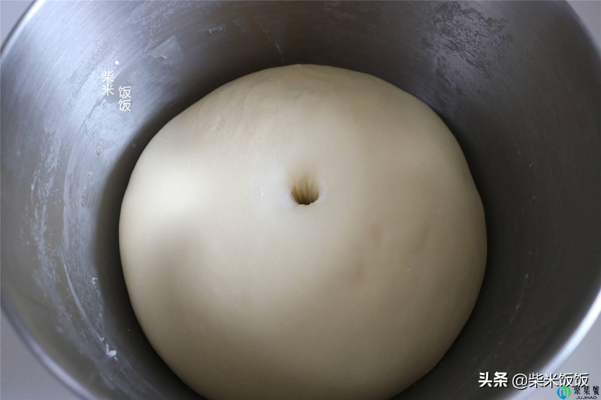 5,手指沾面粉,在面团上戳孔,不回缩不反弹,面团的基础发酵就完成了。