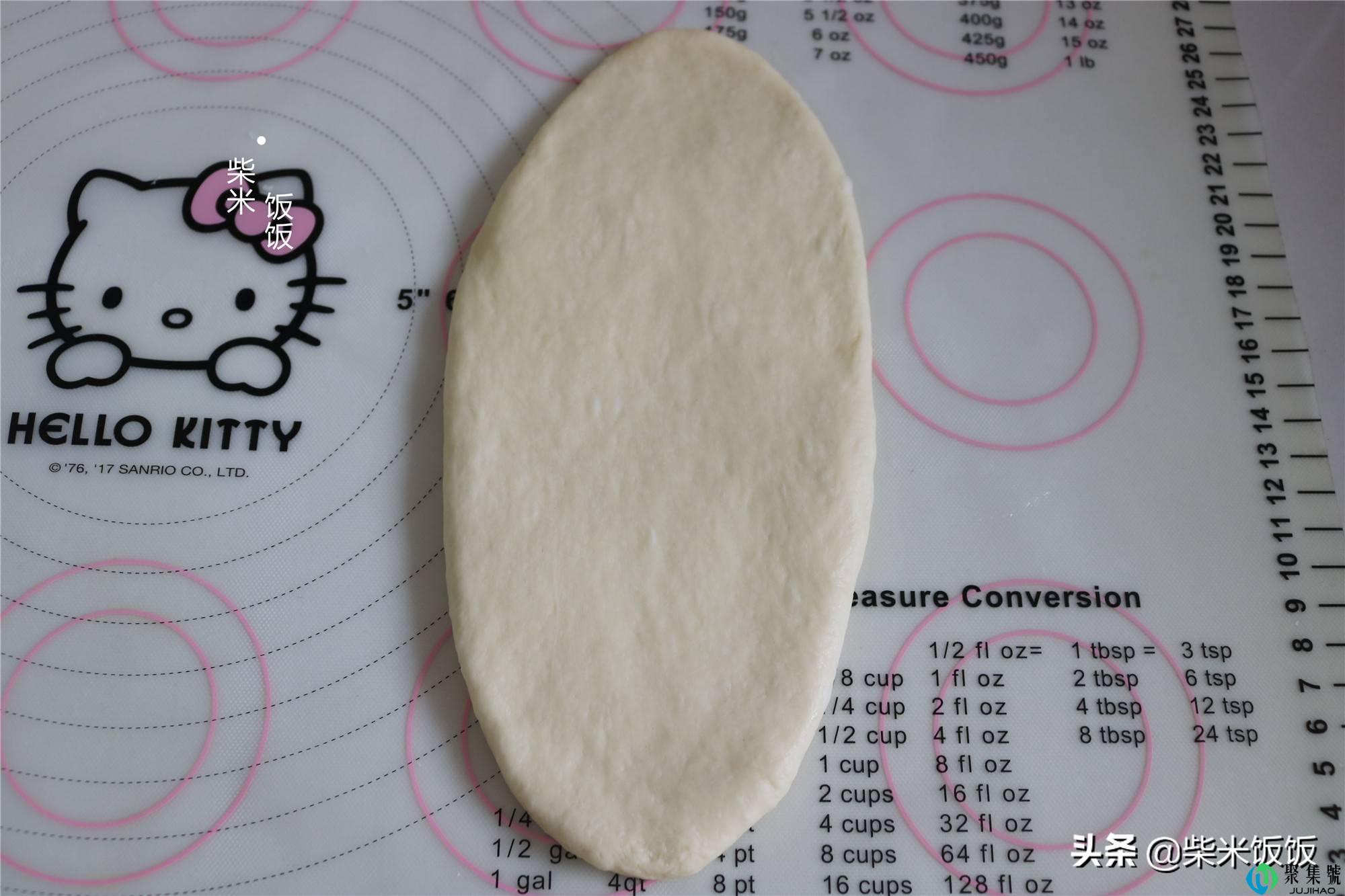 7,第一次擀卷:取一个面团,擀成长舌状。边缘如果有气泡,一定要拍干净。
