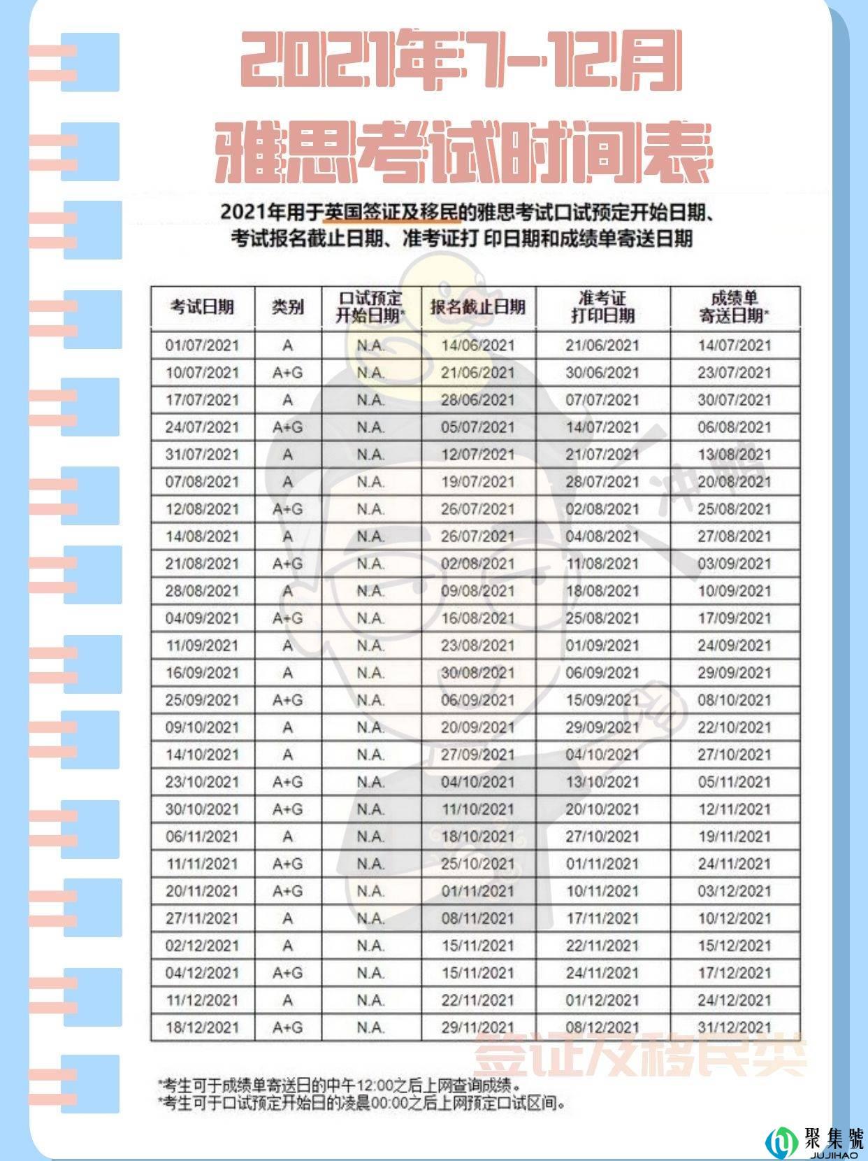 图二:2021年7-12月用于英国签证及移民的雅思考试口试预定开始日期、 考试报名截止日期、准考证打印日期和成绩单寄送日期。