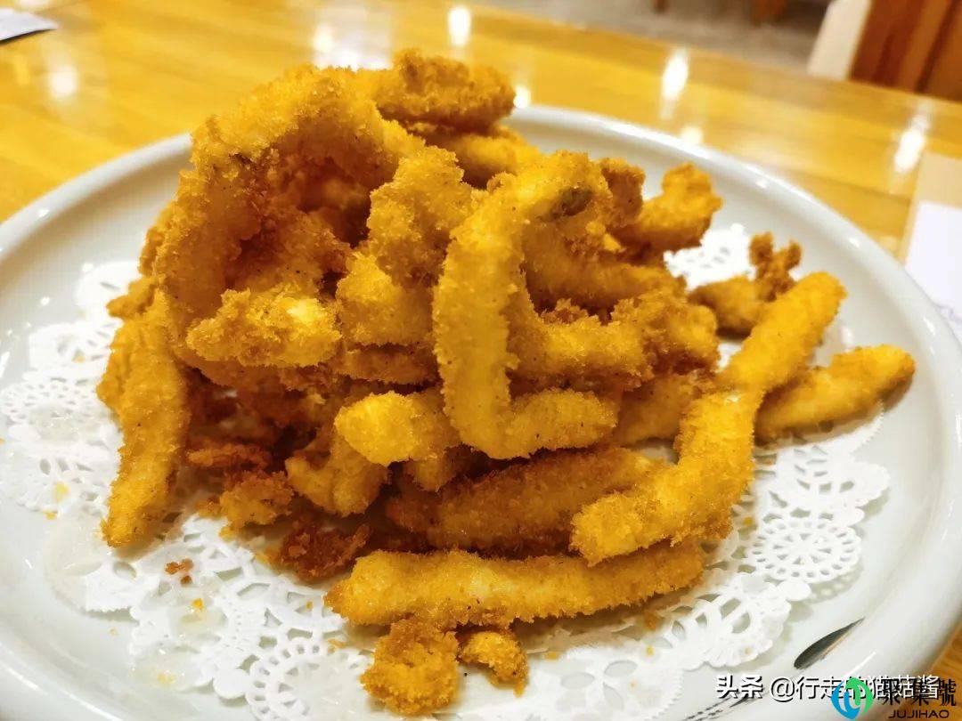 炸鱿鱼须,鱿鱼很新鲜,吃起来酥脆弹牙,可以沾着番茄酱吃。