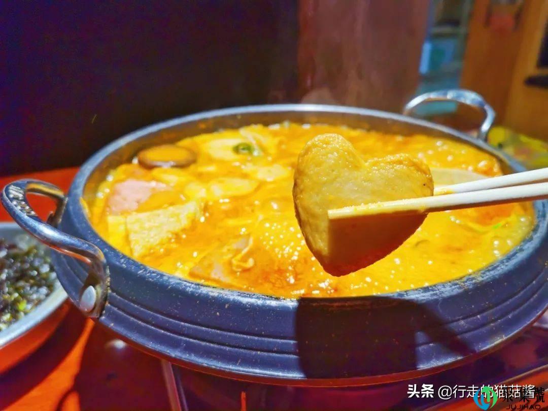 部队锅里面的菜品有肥牛、土豆、豆腐、香菇、蟹棒、金针菇、鱼豆腐、火腿、午餐肉、年糕、鱼糕、小瓜、绿叶蔬菜等等,食材特别丰富,这些吃完了一之后还可以加进去一包拉面当主食。