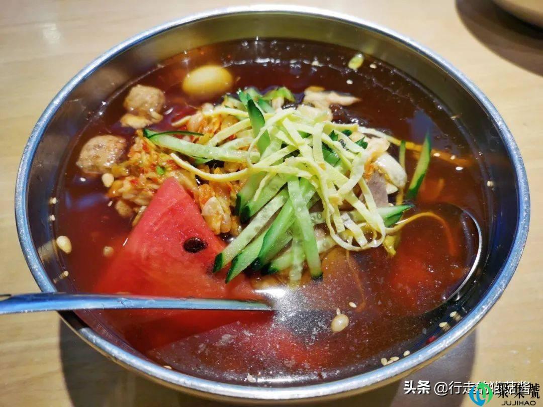 延吉的冷面里面一般放的是牛肉片、鸡肉丸、西瓜或者苹果、包菜、鸡蛋丝、黄瓜丝、鸡蛋等,鸡肉丸子里还有碎骨渣,这个有些吃不惯,大家吃的时候要小心,弄不好牙都能崩到,一点都不夸张。