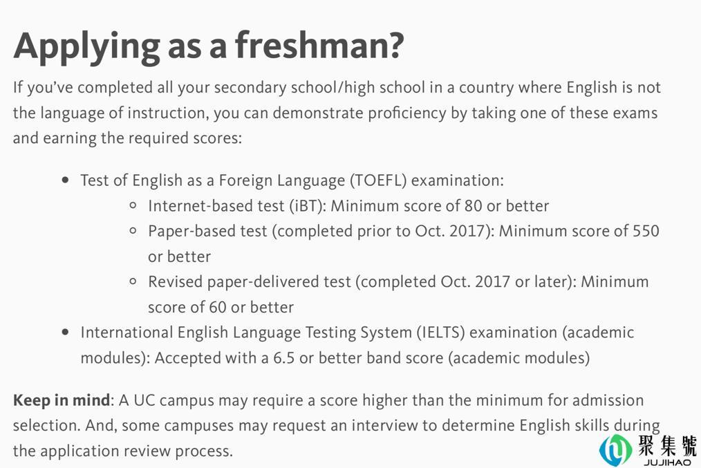 加州部分大学,如加州大学伯克利分校(UC Berkeley全世界排名第4)、加州大学圣芭芭拉分校(UCSB,全世界排名第41)等。官方网站上,对托福分数的要求是:托福iBT(80分以上)。但是还有一行:加州系列大学的录取分数也许比最低分数高,还可能会要求面试,来保证学生英语水平能达到要求。