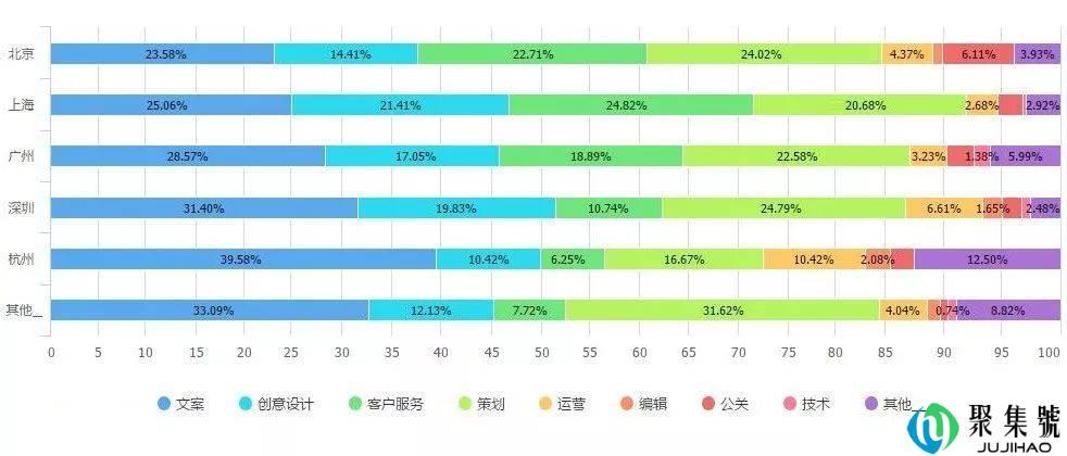 我们将不同城市的广告人横向比较,在计算不同地域样本权重之后发现。上海、杭州的客户服务和创意设计人才比重最大。而在文案和策划方面,北京、深圳和广州具有明显优势。