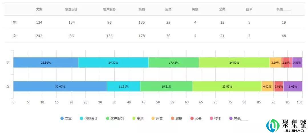 在收集到的问卷样本中,在文案、策划、客户服务三大职能中,女生占据了明显的人数优势,而男生在创意设计岗位上稍胜一筹。