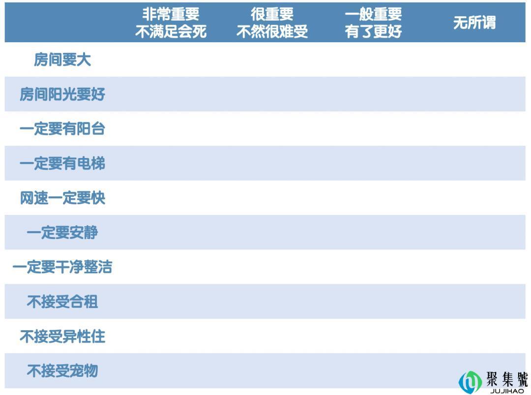 再说房子舒适程度,这个就很复杂了,房间大还是小、有没有阳光、电梯还是楼梯、整租还是合租...一定要想清楚自己看重啥,然后有的放矢,把钱花在刀刃上。大家可以参考下表自评: