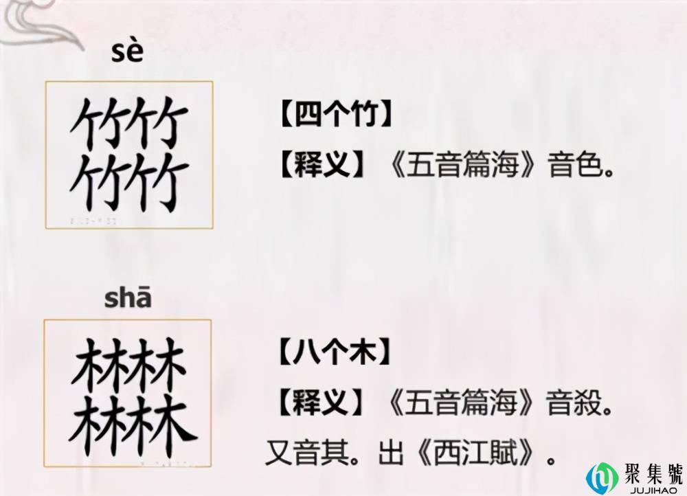 四叠字则是四个相同的字组成一个字,但并不常见,像五叠字、六叠字、八叠字就更难见了,但它们确实存在过。