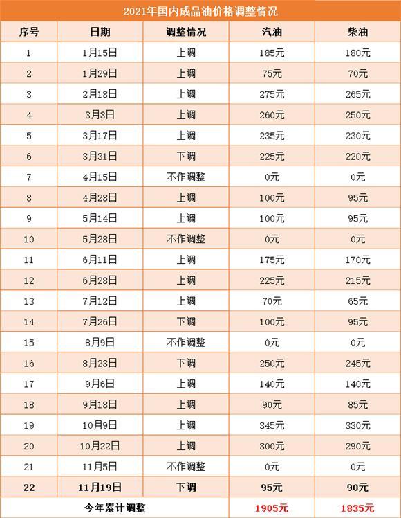 金融界网11月19日消息 自今日24时,国内成品油零售限价调价窗口再度开启。国家发改委消息,根据近期国际市场油价变化情况,按照现行成品油价格形成机制,国内汽、柴油价格每吨分别下调95元、90元,折升价92#汽油下调0.07元,95#汽油及0#柴油均下调0.08元。此次调价落地后,以油箱容量在50L的家用轿车为例,加满一箱92#汽油将少花3.5元左右。