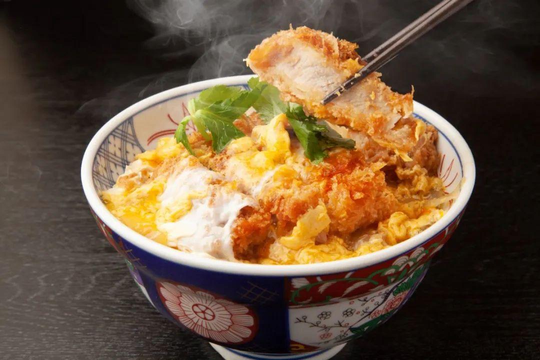 「カツ丼」即“炸猪排盖饭”,其起源也有很多说法,有1897年诞生于山梨县甲府市荞麦面老店「奥村本店」一说,也有大正年间末期诞生于东京早稻田大学附近的荞麦面店「三朝庵」一说等。在日本,最常见的炸猪排盖饭是用酱油味调味汁煮炸猪排和洋葱,再淋入鸡蛋液,放在米饭上制作。因为「カツ」(katsu)这个单词的发音和单词“胜利「勝つ」”发音相同,所以日本人经常在考试或比赛前吃一碗炸猪排盖饭,取个好兆头。