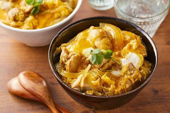 「親子丼」即“鸡肉鸡蛋盖饭”,也可叫“滑蛋鸡肉盖饭”。「親子丼」起源说很多,流传最广的是起源于明治年间日本桥人形町经营着军鸡锅料理的「玉ひで」,客人在吃鸡肉锅吃到最后时喜欢在剩下的肉末汤汁中打入蛋液拌米饭一起吃,第五代店主的妻子在发现客人们这一喜好后决定专门提供一道鸡肉和鸡蛋液共同煮制后盖在米饭上的料理,其实本想称之为“浇汁饭”,但觉得这个名字不符合高大上的店内气质,于是她看着鸡肉鸡蛋一家子在锅里“其乐融融”的样子便灵机一动取名为「親子煮」。除了鸡肉鸡蛋的组合,还有鲑鱼和鲑鱼子组合的「鮭親子丼」「海鮮親子丼」。