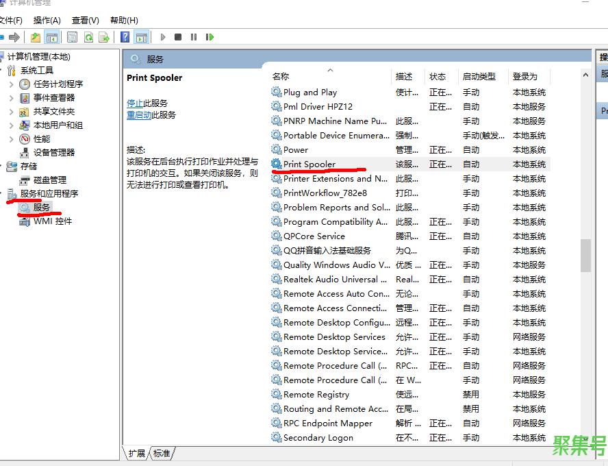 在电脑桌面,右键单击计算机,选择管理。在管理界面,打开服务和应用程序下的服务选项,在服务列表中找到print spooler,选择启用或重新启动,完成相关服务的设置。