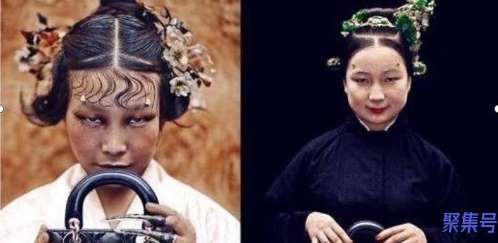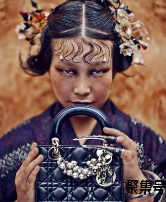 图片中拍摄的是一位亚裔女性,浮肿狭长的眯眯眼,黑紫色的嘴唇,满脸的雀斑,单眼皮、塌鼻子。两根手指戴着黑色的清朝护甲,手里举着迪奥新款的包包,阴恻恻、似笑非笑地看向镜头。