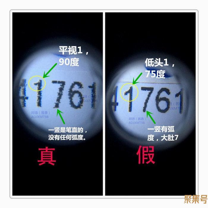 有机码处需重点关注数字“1”和数字“7”的字体。真:数字“1”是成90度角,我叫它为“平视1”,数字“7”的一竖是直的。假:数字“1”是成75度角,我叫它为“低头1”,数字“7”的一竖是有弧度的,像挺着大肚子一样,简称“大肚7”。