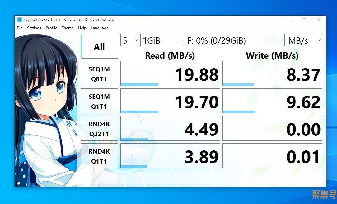 很明显,普通U盘读取速度仅19.88MB/s,写入速度8.37MA/s,而aigo固态U盘U393读取速度达到了456.64MB/s,写入速度达到了414.54MB/s,后者比前者读写速度快多了,同时它和官方给出的数据也很接近。