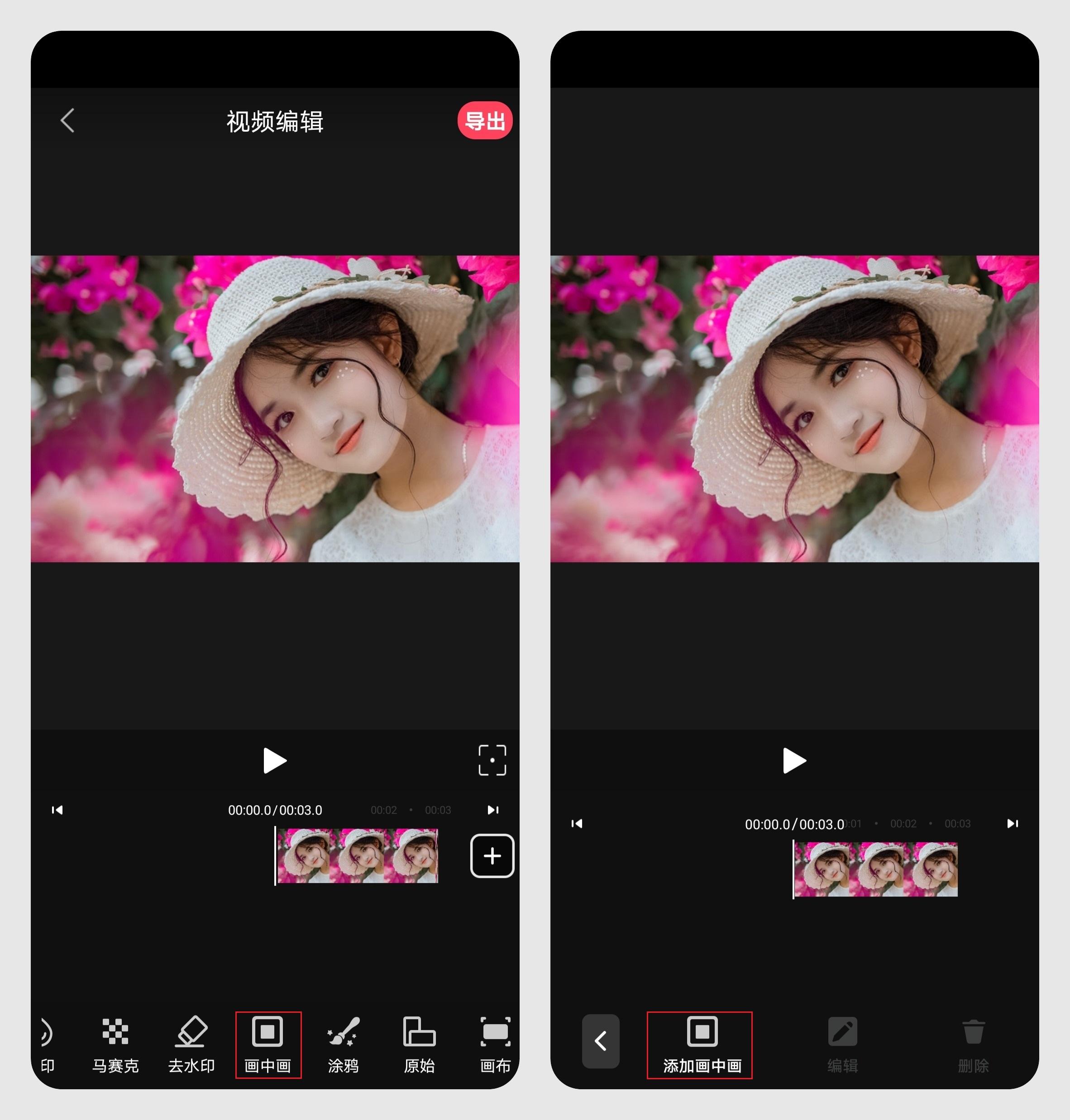 2、进入视频编辑阶段,选择页面下方功能栏中的「画中画」,并添加画中画效果。