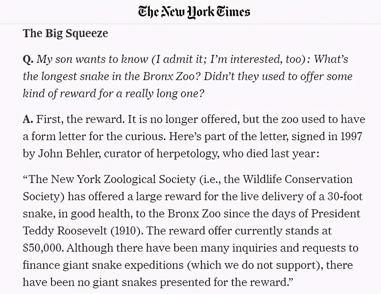 尽管有那么多巨蟒的“发现记录”,但有一个从1910年代开始到二十一世纪初期的巨蟒悬赏记录却也只没有人揭榜,当年的要求是找到一条30英尺(9.144米左右)并且仍然活着的巨蟒,即可获得悬赏金5000美元,后来这个金额上涨到了5万美元,不过一直没有人揭榜。
