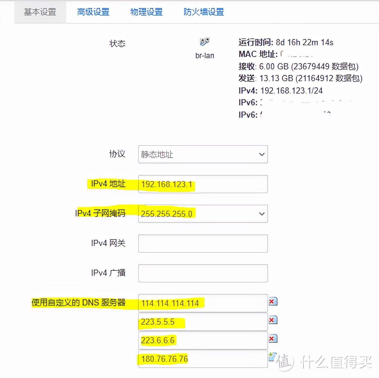 配置LAN,IPv4地址可以自定义,不要用192.168.1.1和192.168.0.1,因为这两个网段容易和光猫的dhcp默认网段冲突。因为习惯了Hiboy大佬的padavan,所以我沿用了192.168.123.1作为路由器IP。