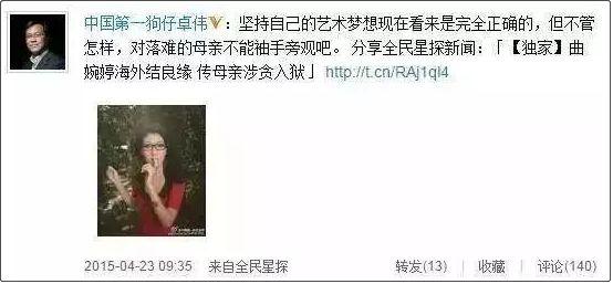 直到“中国第一狗仔”在微博上对其公开喊话,才彻底戳破了她的假面,或许此前的曲婉婷还以为网友们不知道她有一个贪污犯的母亲,然而当卓伟当众撕毁她的假面之后,曲婉婷终于不再伪装。