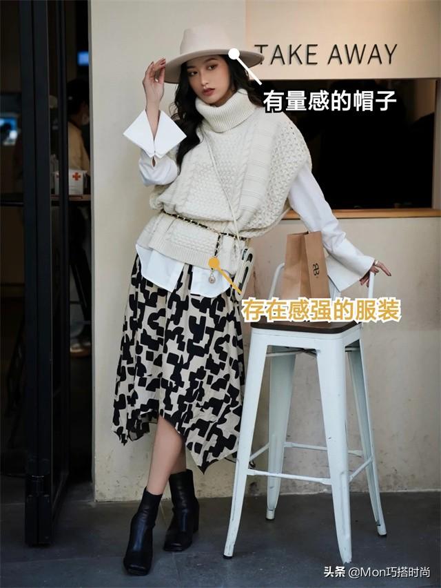 就拿上面这套搭配来说:厚实的粗针织毛衣马甲通过与白衬衫的叠穿,配上存在感极强的复杂印花半裙,服装的量感就比较大。