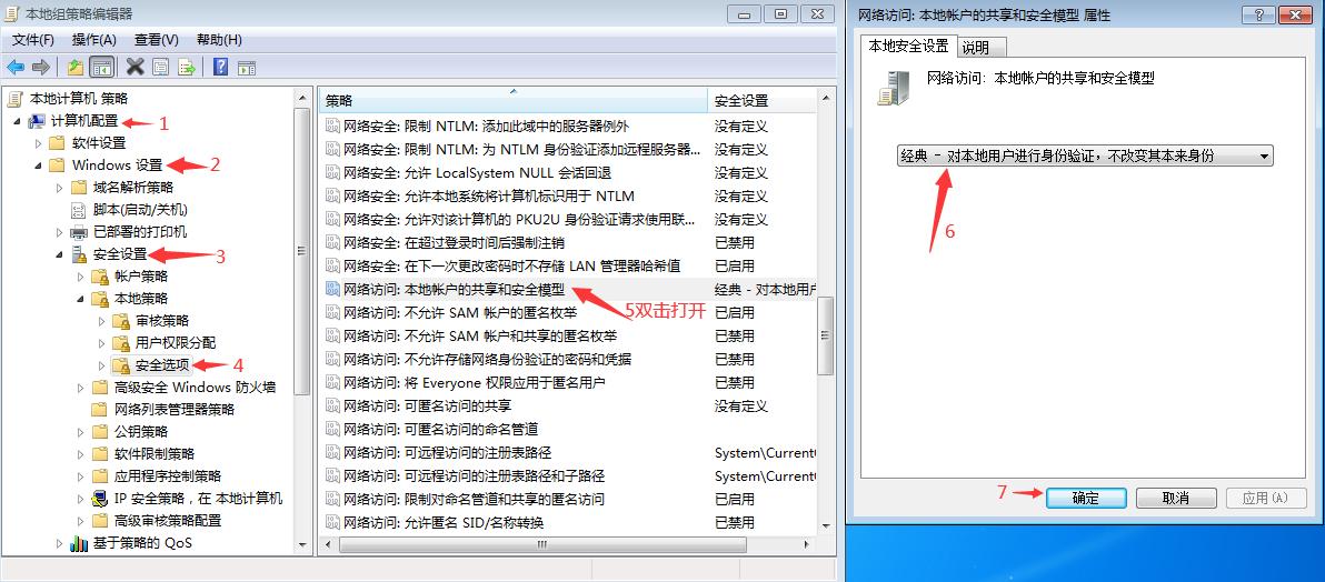 第四步:计算机配置---windows设置---安全设置--本地策略--安全选项--右边找到''网络访问:本地帐户的共享和安全模式"双击改成"经典:本地用户自己的身份验证"