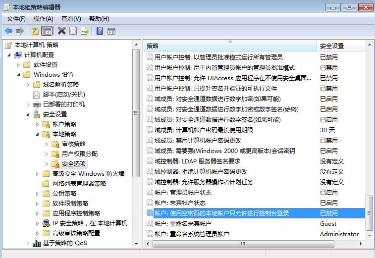 第五步:windows设置---安全设置--本地策略--安全选项--右边找到“帐户:使用空白密码的本地用户只允许进行控制台登陆”把他设置为"禁用<问题解决~