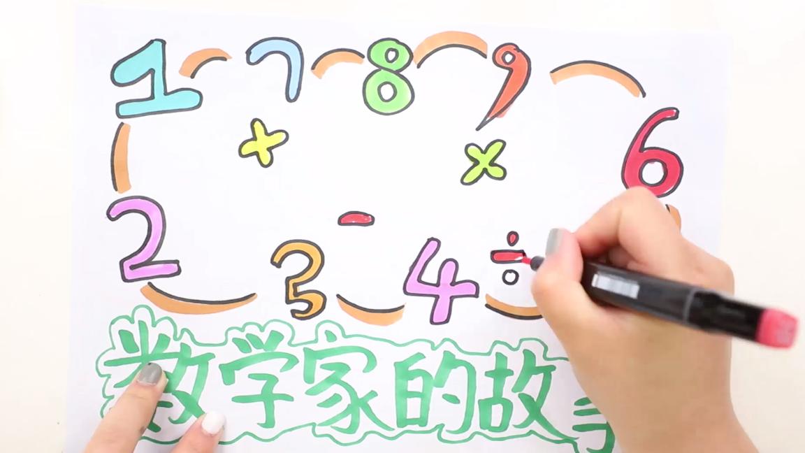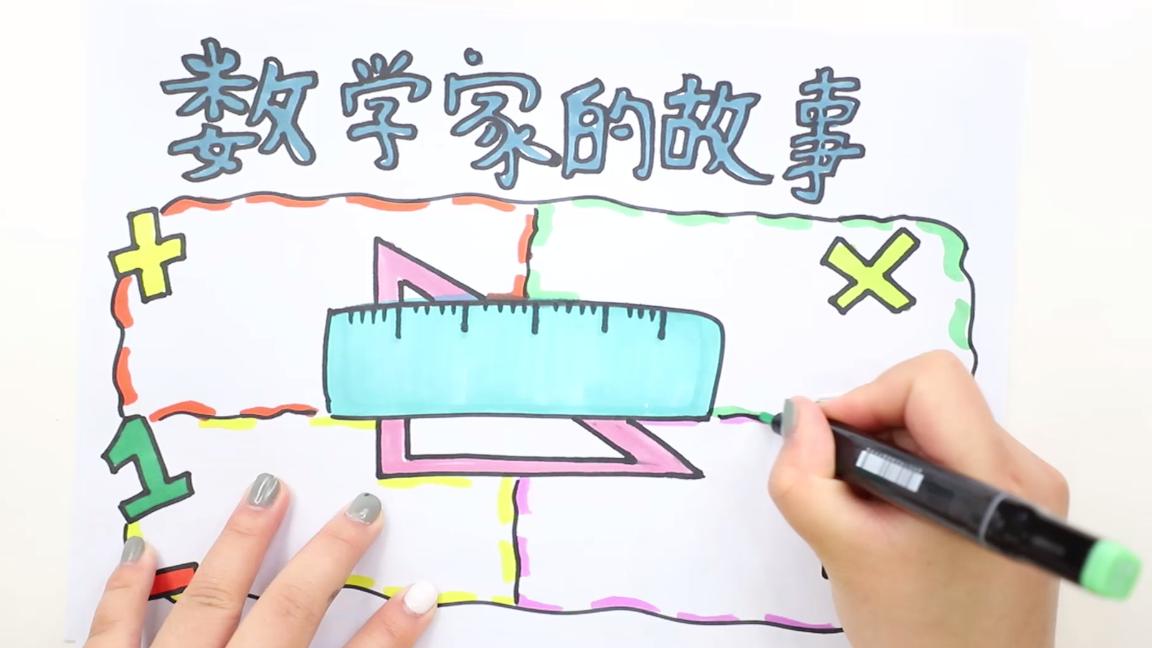 ①画出主题,画上装饰画,画上数学工具直尺和三条尺,画上加减乘除号,写上数字;