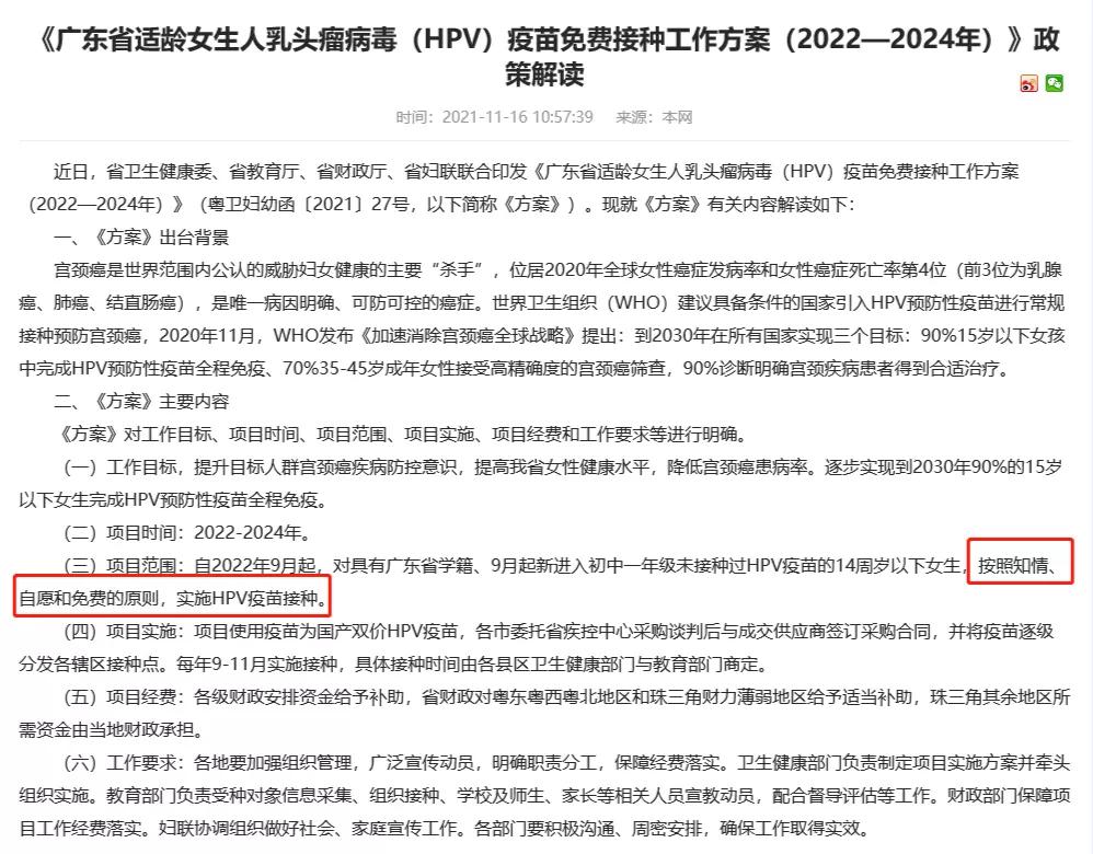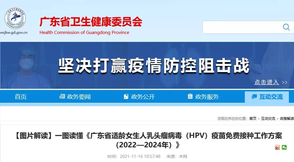 并于16日在广东省卫生健康委官网发布《广东省适龄女生人乳头瘤病毒(HPV)疫苗免费接种工作方案(2022—2024年)》政策解读。