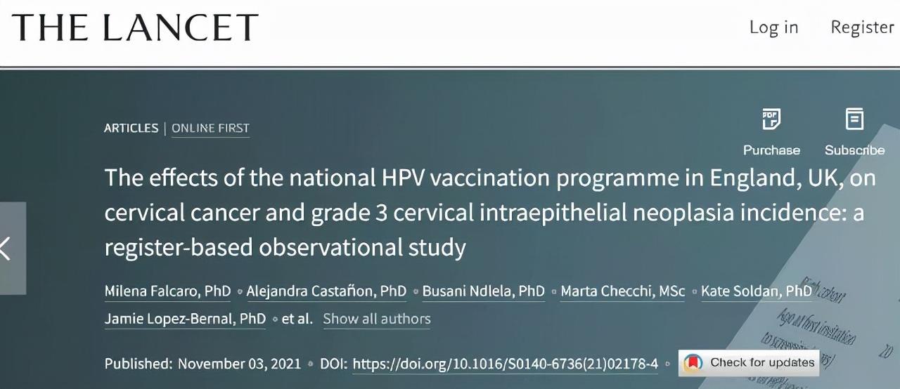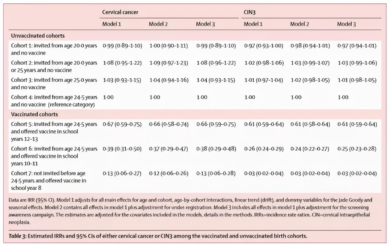 该研究是基于英国“12-13岁”、“14-16岁”、“16-18岁”3个不同年龄队列女孩的数据,结果证实了接种HPV疫苗可减少多达87%的宫颈癌以及多达97%的宫颈上皮内瘤变3级(CIN3)。