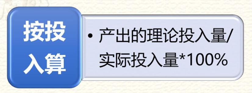 投入产出达标率的第二种算法,按产出算,即以最终的产出数量为基数进行计算。其计算公式为,投入产出达标率=实际产出量/投入的理论产出量*100%。投入的理论产出量是指,将投入的原料,按照产品的配方或标准BOM,理论计算出来的产出数量。