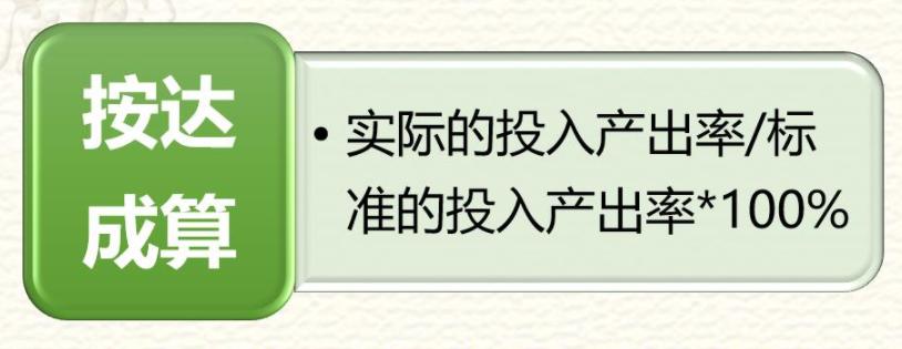 投入产出达标率的第三种算法,按达成算,即按标准的投入产出率达成情况进行计算。其计算公式为,投入产出达标率=实际的投入产出率/标准的投入产出率*100%。