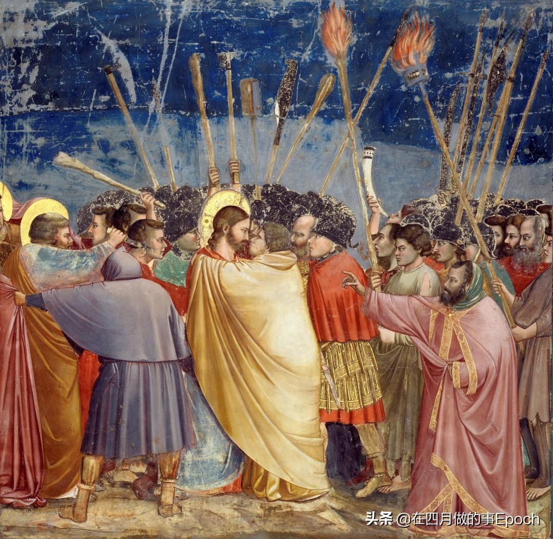 《犹大之吻》是十三世纪后期佛罗伦萨大画家乔托迪邦多纳创作的湿壁画,现收藏于意大利帕多瓦的斯克罗威尼礼拜堂。