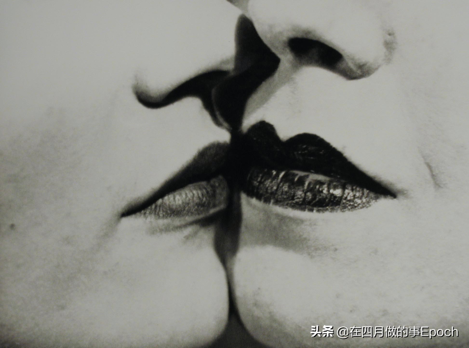 曼·雷这幅被剪裁的摄影作品展现了他对电影化叙述的兴趣,这张照片就像一个电影的剧照。呈现了一对情侣柔软的充满情欲的亲吻。或许,可以说这只是吻的信号,因为嘴唇只是轻微触碰了一下。曼·雷作为一个商业艺术家,被达达主义、立体主义、未来主义以及超现实主义影响。一方面,他作为一名时尚摄影师,实际上他还创造了一种无相机摄影-camera-less photography的方式,他自己命名为"雷摄影"。