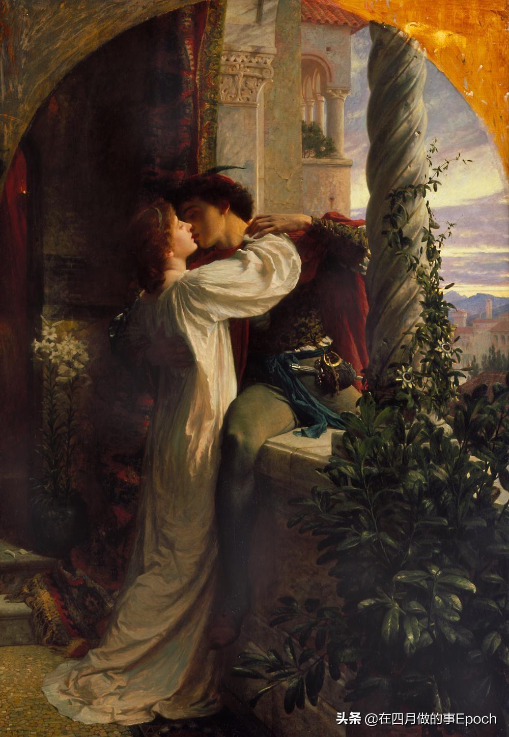 该幅油画出自英国画家弗兰克迪科塞尔之手。弗兰克迪科塞尔1924年被选为英国皇家艺术院院长,1925年被授以皇家爵士爵位。他大部分的画作都以戏剧性的历史和传奇的故事为主题,并以在绘画中完美表现优雅时髦的女人的画风而著称。《罗密欧与朱丽叶》目前陈列于英国南安普顿市美术馆,表现的是罗密欧与朱丽叶这对悲剧爱侣在婚礼初夜后离别前的匆匆一吻,而当时他们并不知道这也将成为他们爱情生涯的最后一吻。该画画面色彩艳丽饱满,人物神态惟妙惟肖,将一对分别在即的情人之间充满甜蜜与不舍的情愫描绘得入木三分。