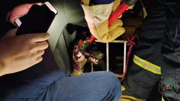 一名男子带着一只大约8个月大的德国牧羊犬来到站里,求助消防员帮忙解救自家“毛孩子”被铁链环扣卡住的舌头。