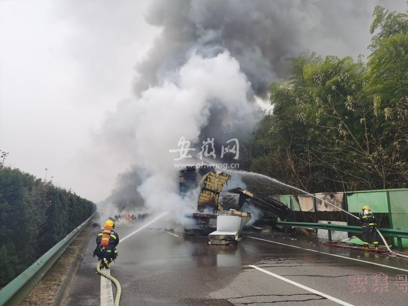 新安晚报 安徽网 大皖新闻讯 12月11日8时许,G50沪渝高速芜湖往安庆方向407公里处(九华山北收费站以东约3公里,池州市境内)两辆货车刮擦追尾后发生火灾。经过池州消防3个多小时的奋力扑救,现场大火被扑灭,但两辆大货物上的货物已被全部烧光。