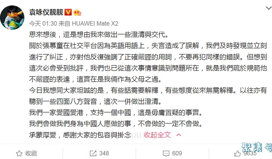 【环球网报道 记者赵友平】香港艺人袁咏仪今日(14日)凌晨1时许在微博发文,回应其子之前在社交平台“因为英语用语失言造成的误解”,称她及时发现并立刻进行纠正。袁咏仪还表示:“我们一家爱国爱港,支持一个中国,这是毋庸置疑的事实”。