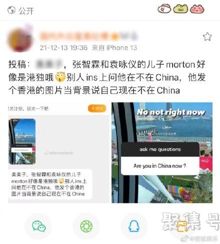 近日,有网友在微博爆料称,香港艺人张智霖与袁咏仪儿子“魔童”(张慕童)“好像是港独”。原因是有人在社交媒体Ins上问他在不在中国,他发了个香港的图片当背景却说自己不在中国。↓