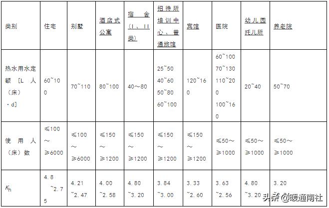 注:1.Kh应根据热水用水定额高低、使用人(床)数多少取值,当热水用水定额高、使用人(床)数多时取低值,反之取高值,使用人(床)数小于等于下限值及大于等于上限值的,Kh就取下限值及上限值,中间值可用内插法求得;