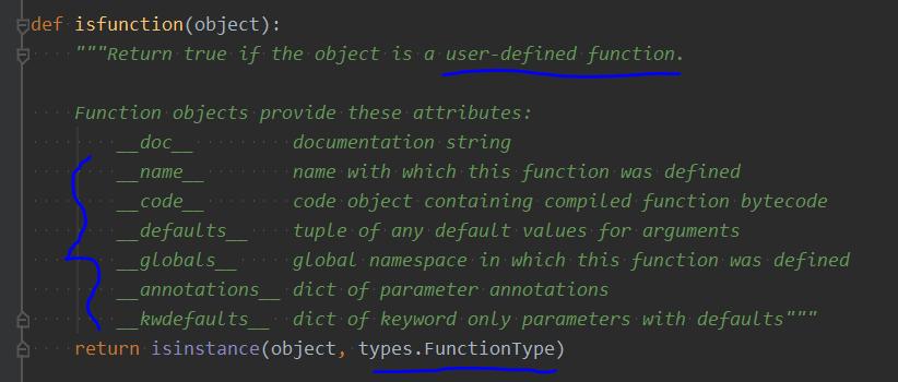 isfunction() 判断出的是用户定义的函数(user-defined function), 它拥有__doc__、__name__ 等等属性