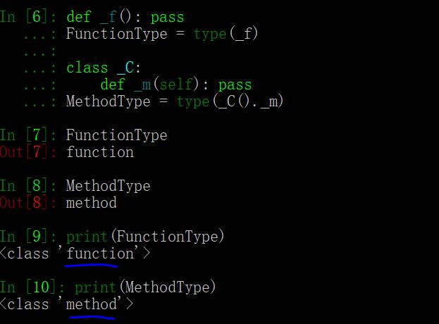 # 摘自 types.py def _f(): pass FunctionType = type(_f) class _C: def _m(self): pass MethodType = type(_C()._m)