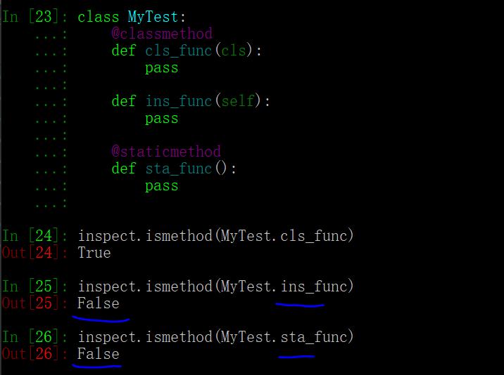 可以看出,除了 classmethod 之外,只有类实例的实例方法,才会被 ismethod() 判定为真!而静态方法,不管绑定在类还是实例上,都不算是“方法”!