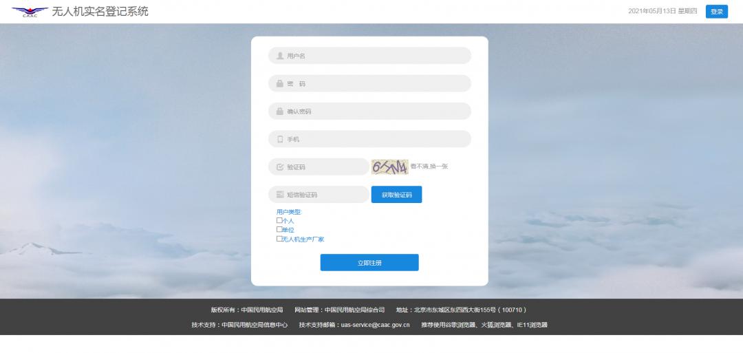 https://uas.caac.gov.cn/login。如还没有注册,请点击右“用户注册”按钮,填写注册信息。需要注意的是,用户名为数字、字母组合,不能包含特殊字符。密码则要求必须有特殊字符。注册账户后,登录系统。