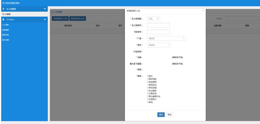 点击左侧的“无人机管理”,点击“新增品牌无人机”,填写无人机序号、厂家、型号、空重、用途等信息。无人机序号可在产品包装或无人机机身上查看(如没有可以自定义),填写后点击提交。如果是自制的无人机的话,点击新增自制无人机,填写相应信息提交。