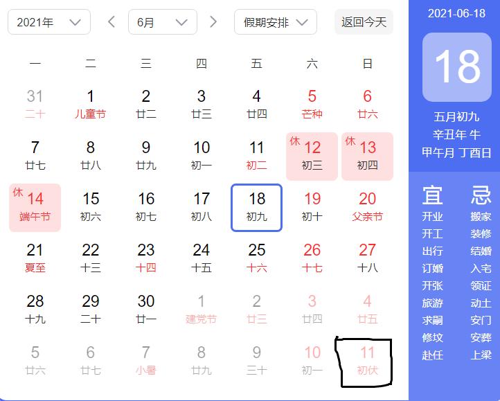 从上面60甲子法中我们可以看出,天干是10天为一轮,也就是说,每10天就会出现一个庚日,如庚子日、庚寅日、庚辰日、庚未日等等,而今年从夏至节气过后的第3个庚日是庚子日,也就是阳历的7月11日,这么算下来,今年的三伏天起始时间是7月11日。
