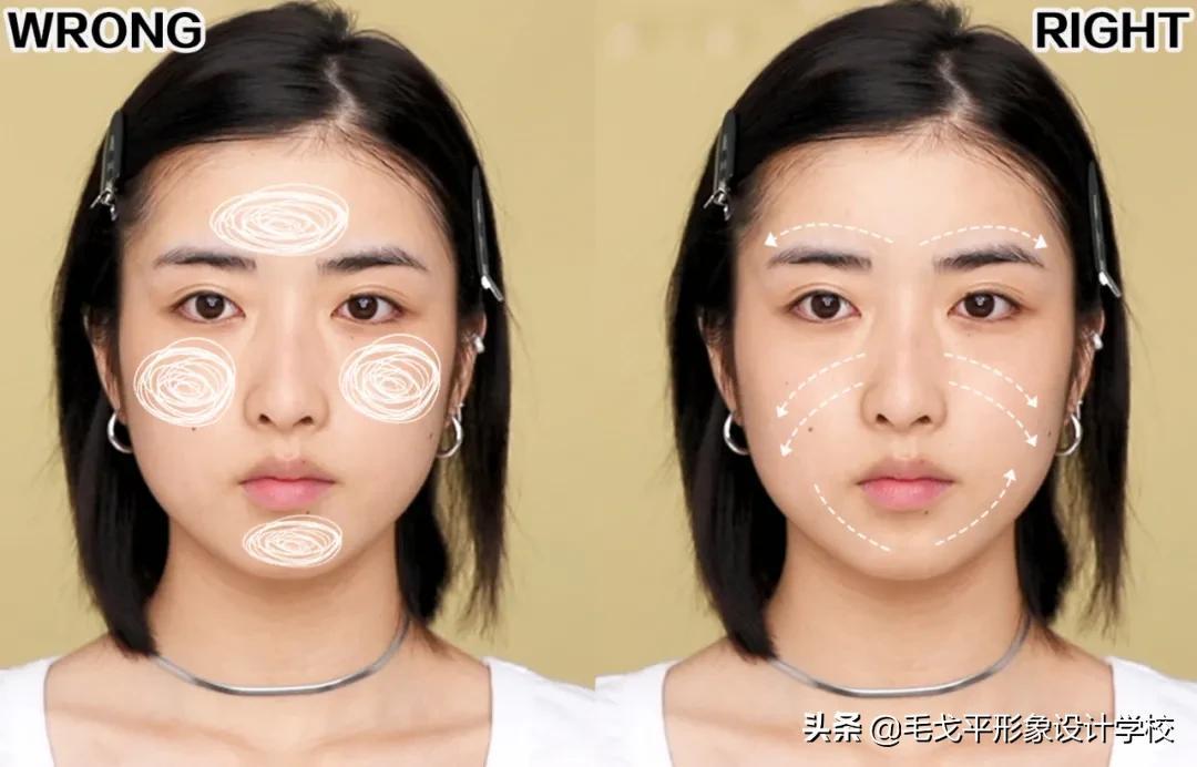 注意要顺着毛孔方向单方向涂抹,千万不要来回涂抹,会造成搓泥或假面感。小细纹和毛孔明显部位,可沾上适量妆前乳/隔离加强,让底妆更精致!