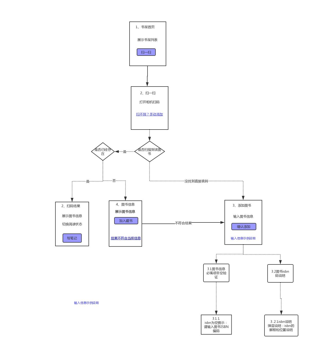 通过页面点击动作后会分为有几条逻辑线,每个逻辑的过程以及跳转。比如4.图书信息的页面,核心元素分为展示扫描到的图书信息和结果不符合两部分,如果结果符合就点击加入藏书完成,不符合就点击不符合进入下一页面逻辑,这就是不同的元素会触发不同逻辑;